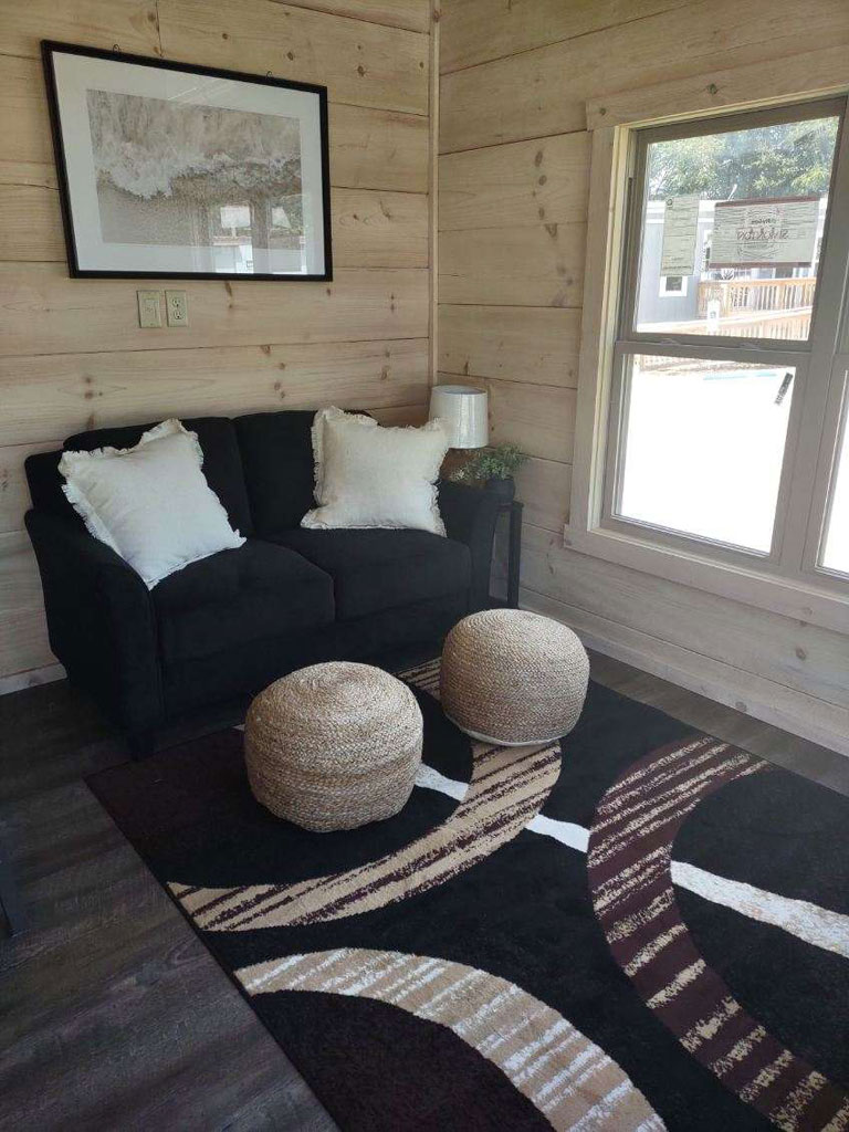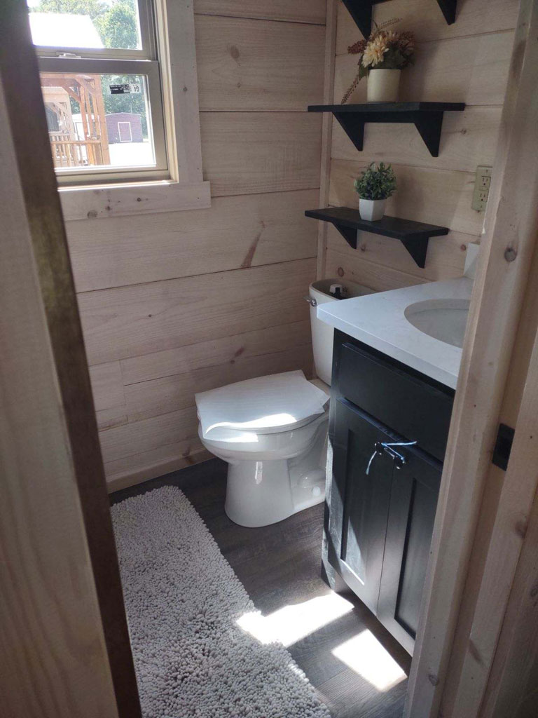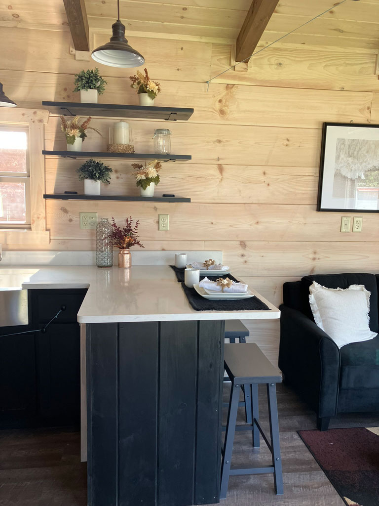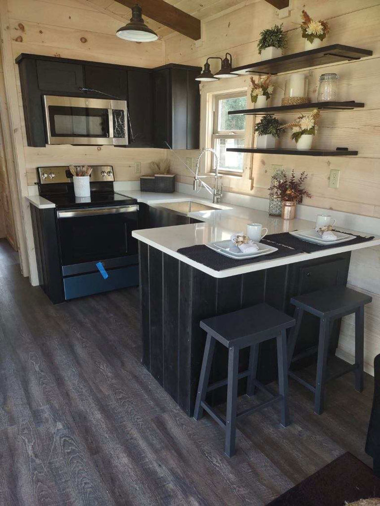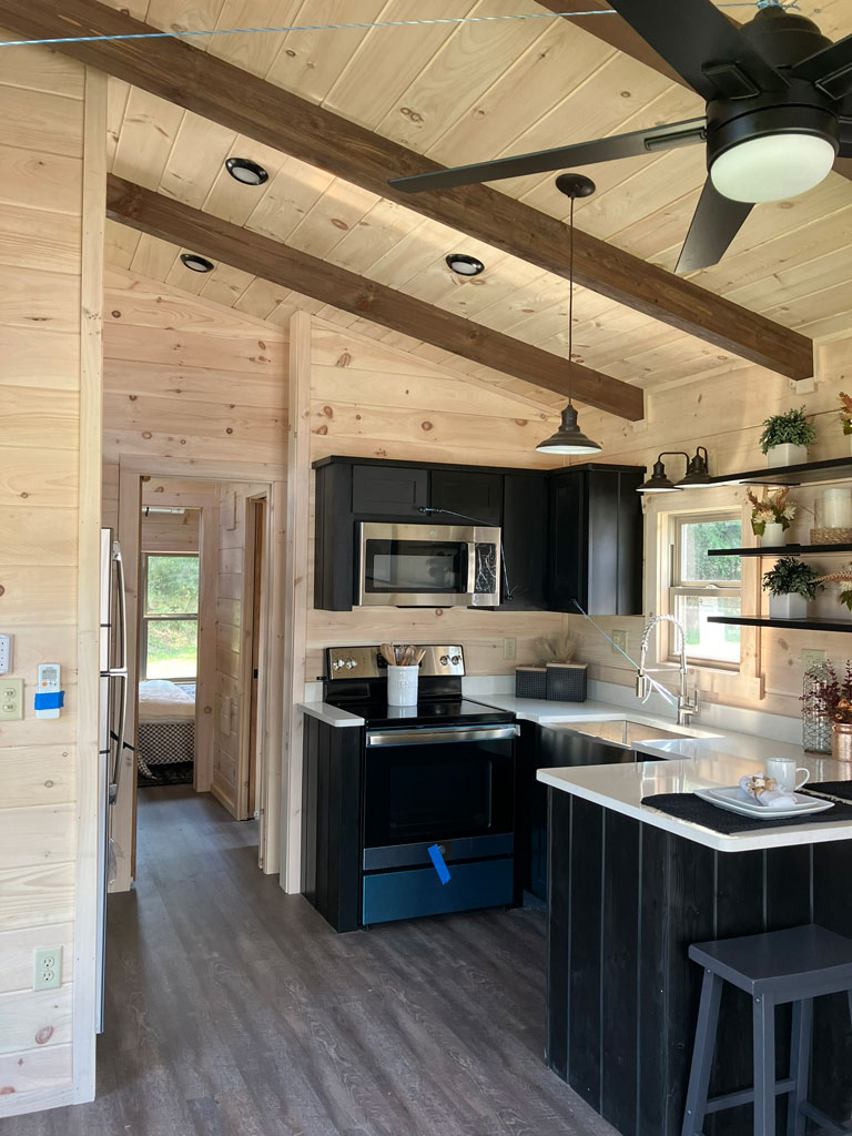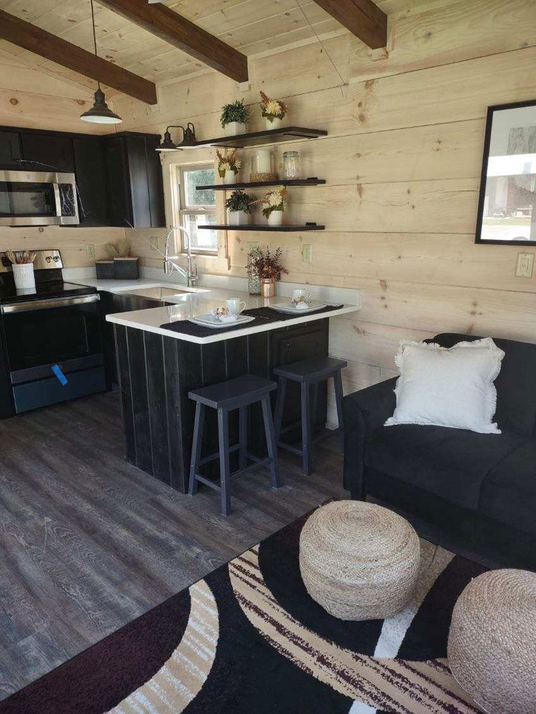 The Blackberry tiny home has natural wood features, making room for plenty of color choices throughout the living room, kitchen, bath, and bedroom. This is a customizable floorplan and you can easily add an optional loft and sunroom porch.