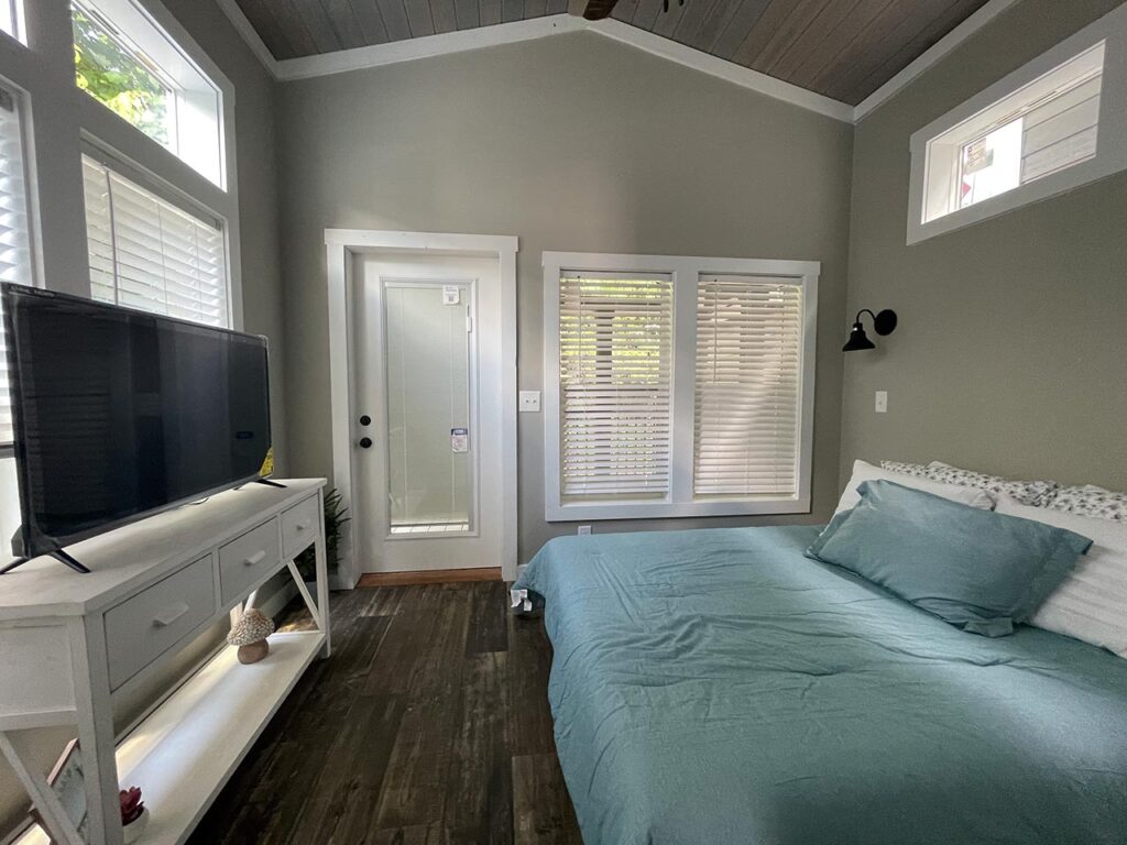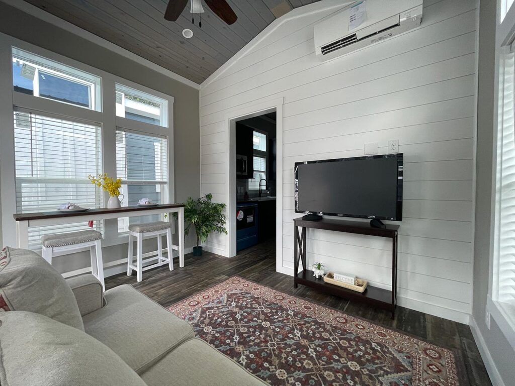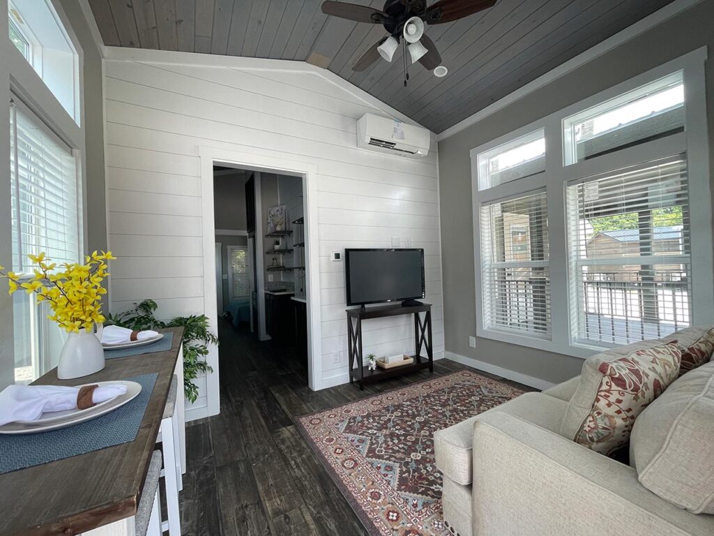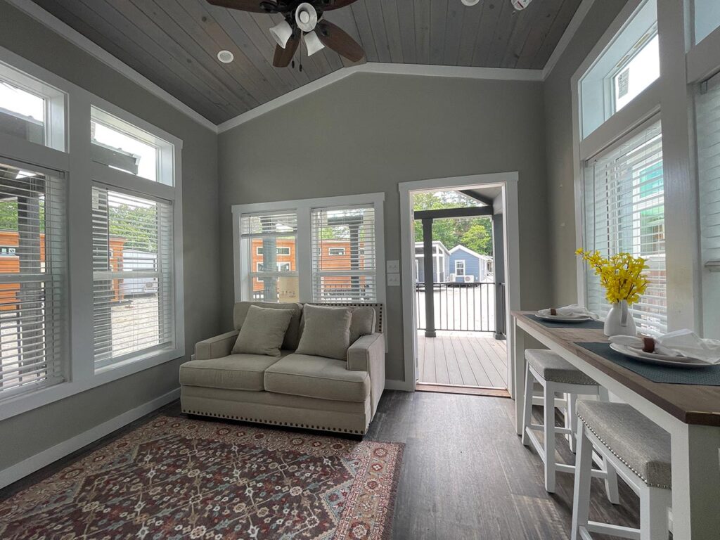 This Cahaba model tiny home is a 396 square feet, 13′ x 47′, 1 bedroom, 1 bath RV park model that comfortably sleeps 4 people.