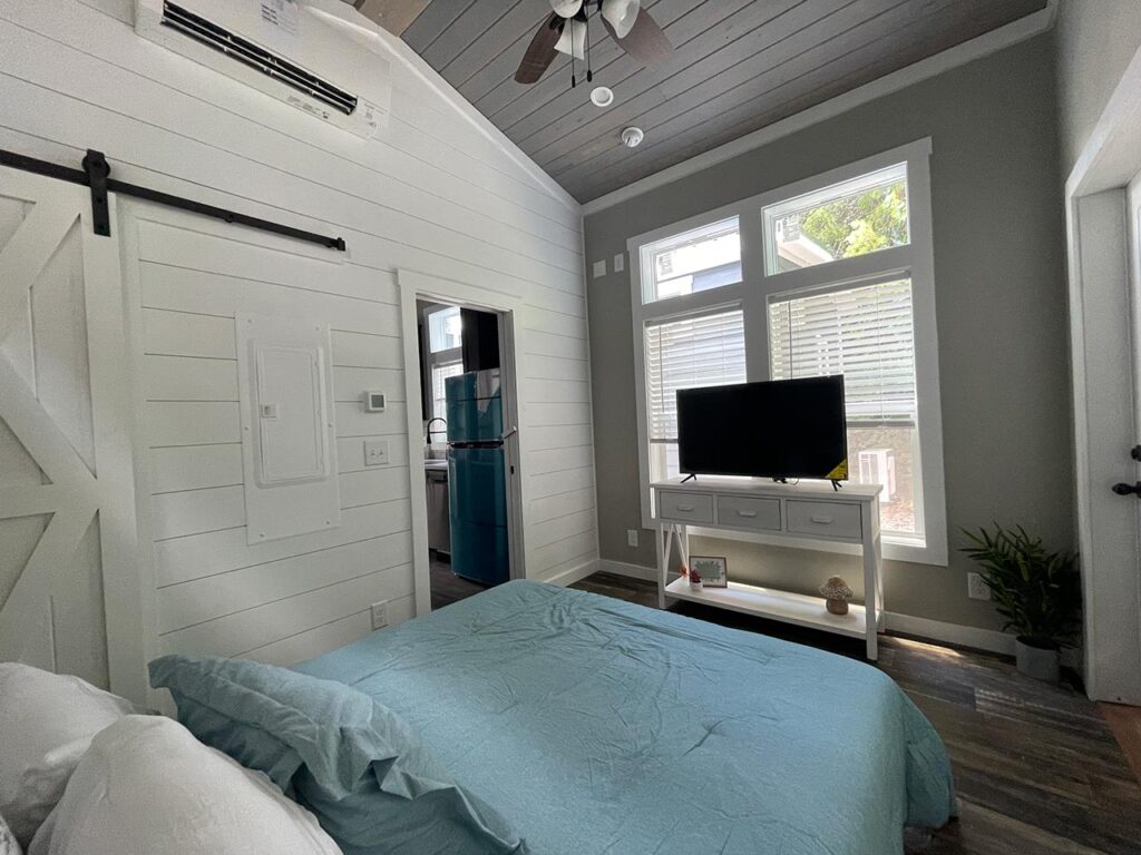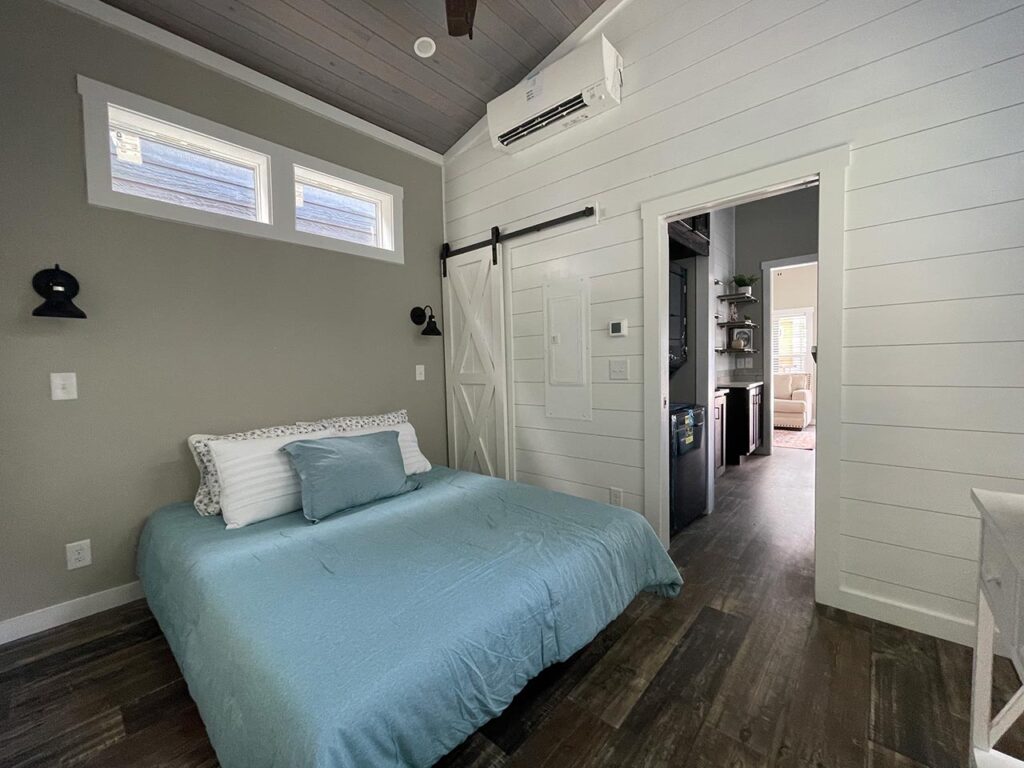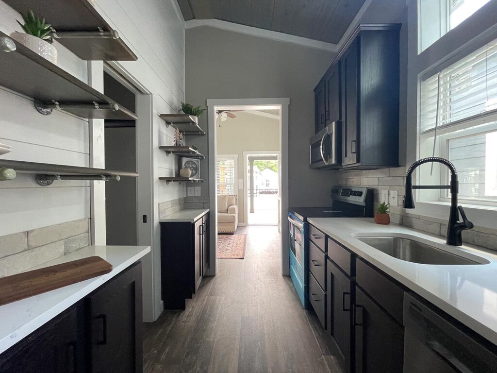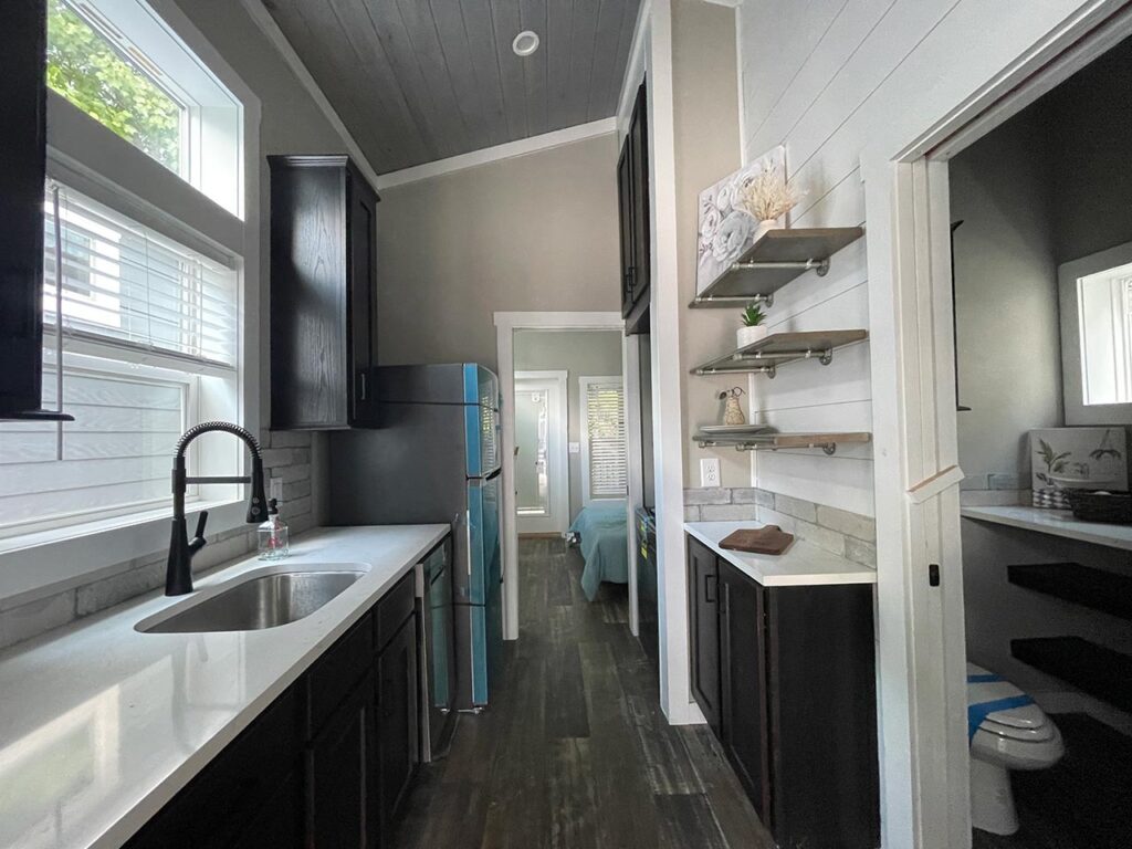 This Cahaba model tiny home is a 396 square feet, 13′ x 47′, 1 bedroom, 1 bath RV park model that comfortably sleeps 4 people.