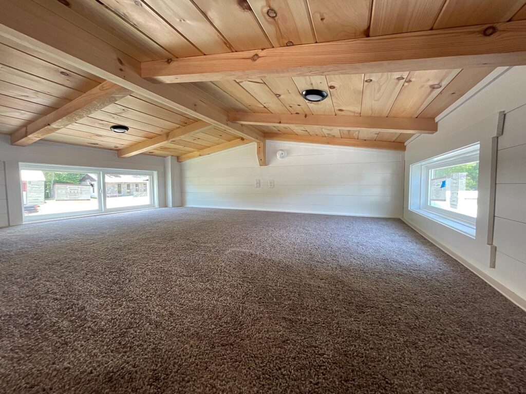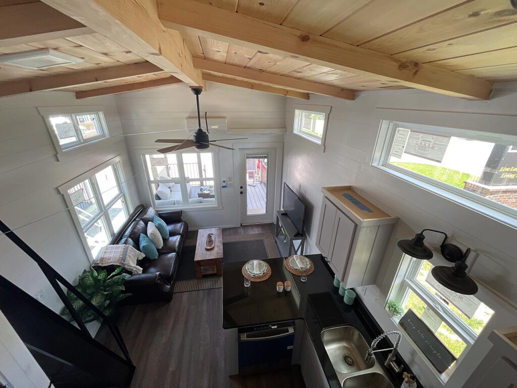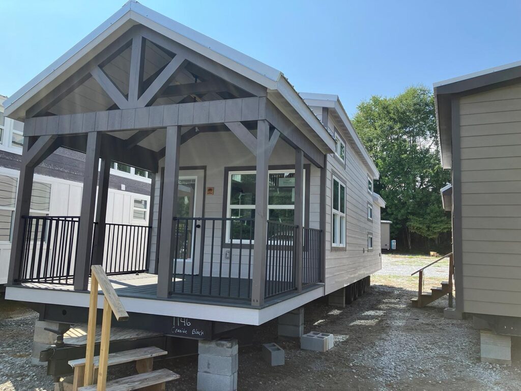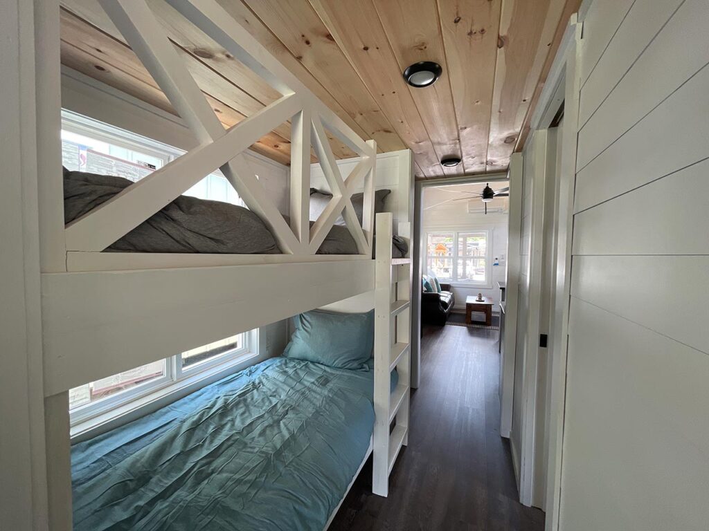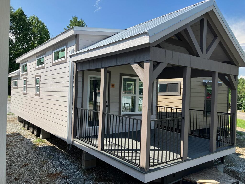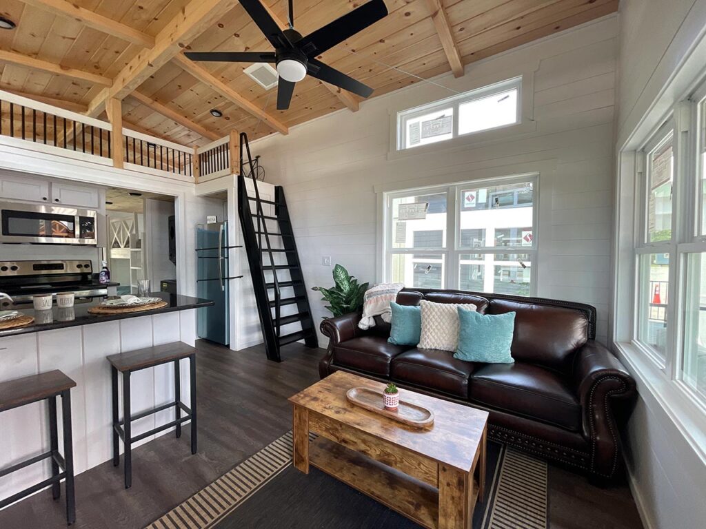 This Smoky model tiny home is a 397 square feet, 12′ x 44′, 1 bedroom, 1 bath RV park model with a loft that comfortably sleeps 6 people.