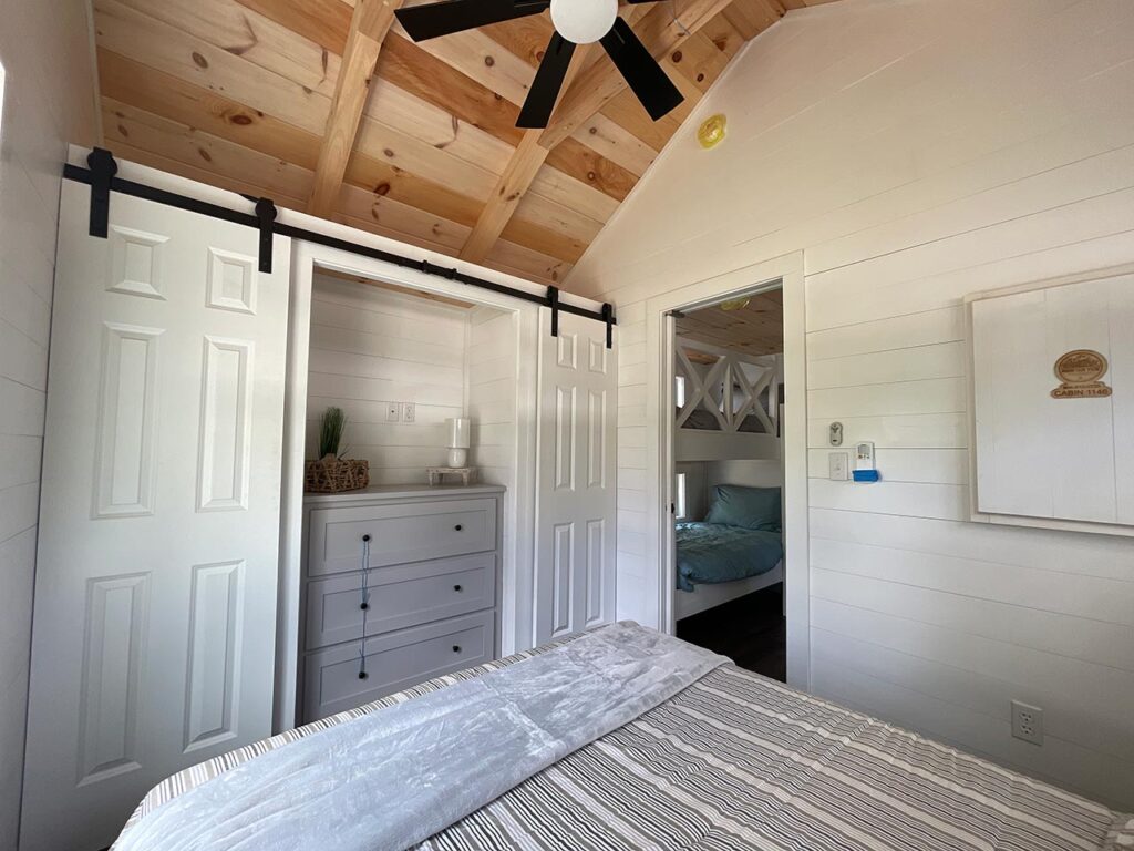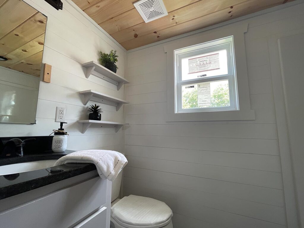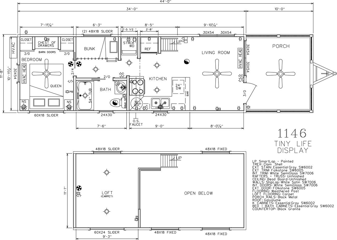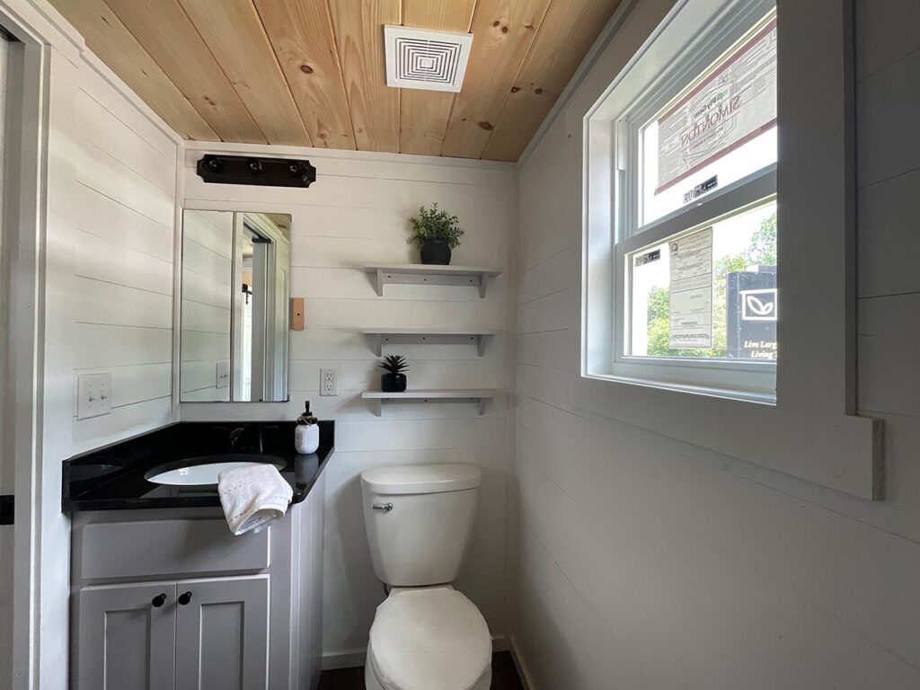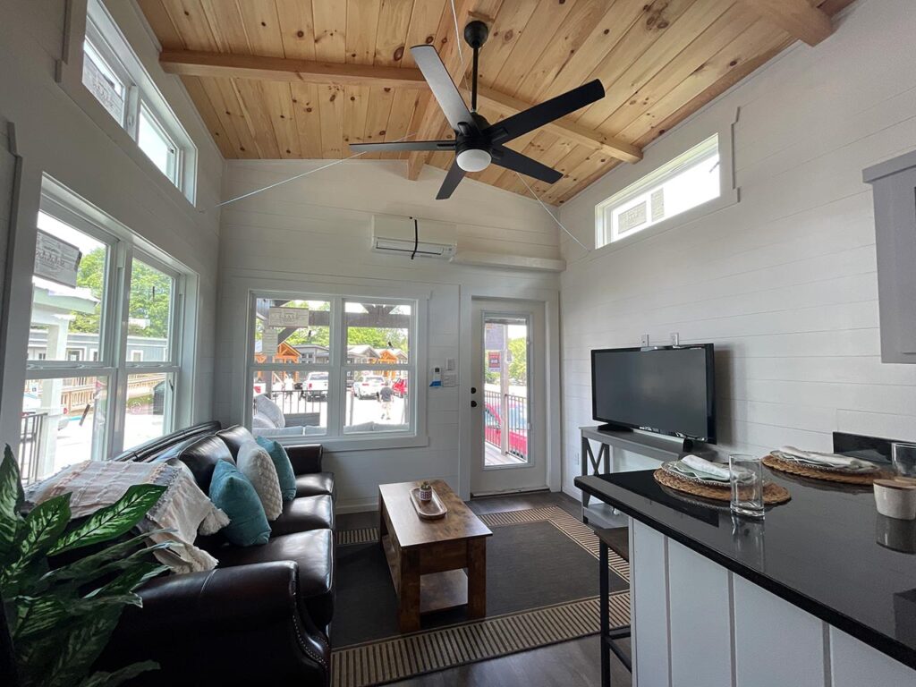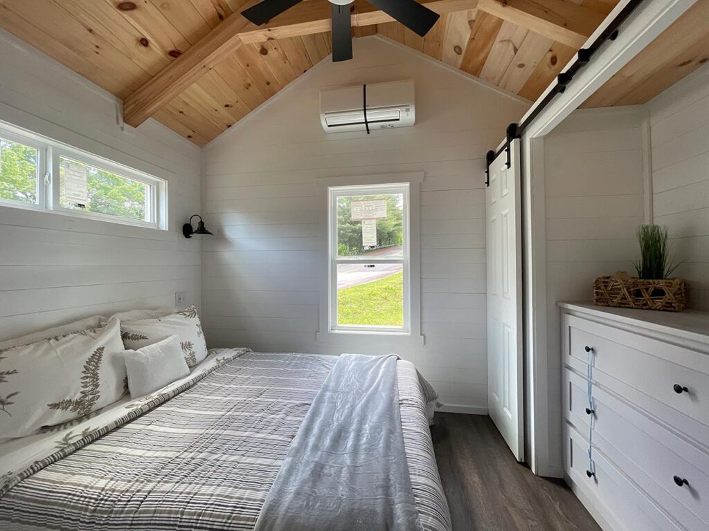 This Smoky model tiny home is a 397 square feet, 12′ x 44′, 1 bedroom, 1 bath RV park model with a loft that comfortably sleeps 6 people.
