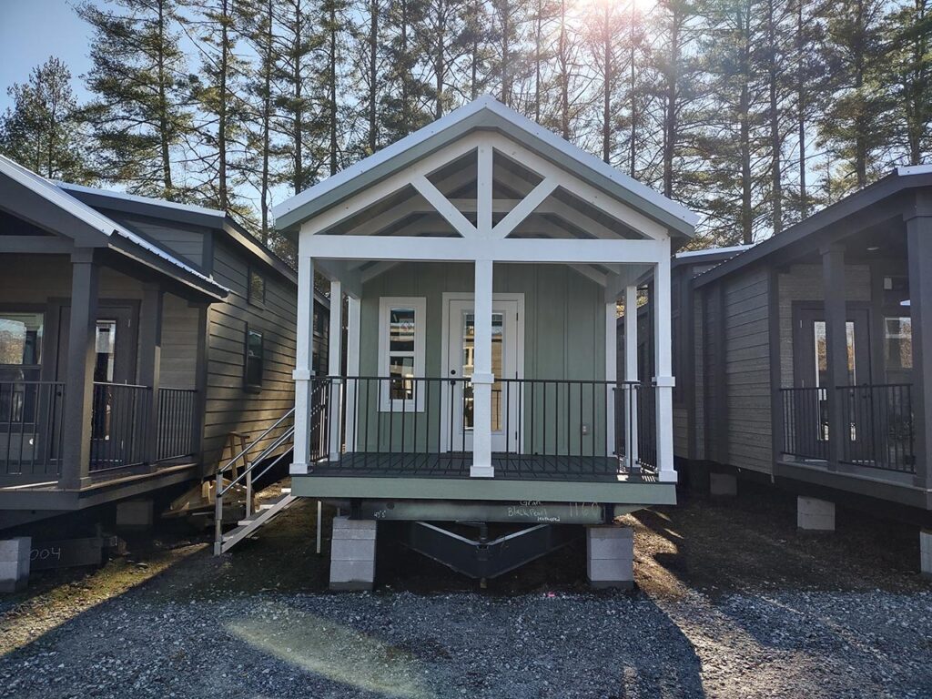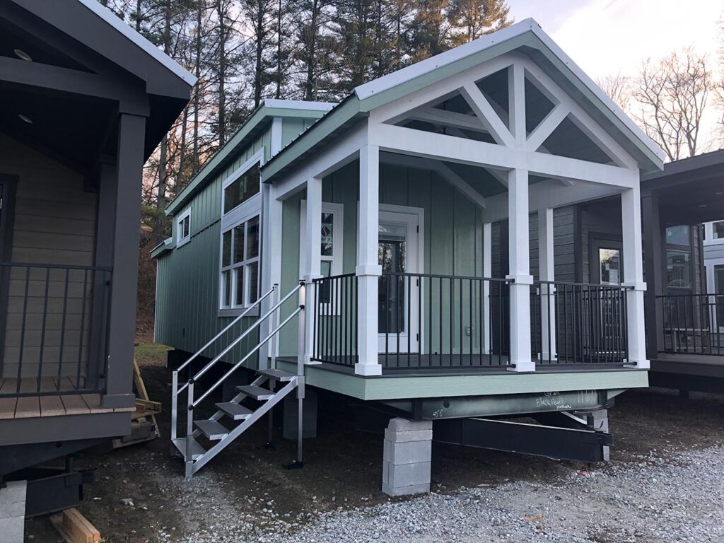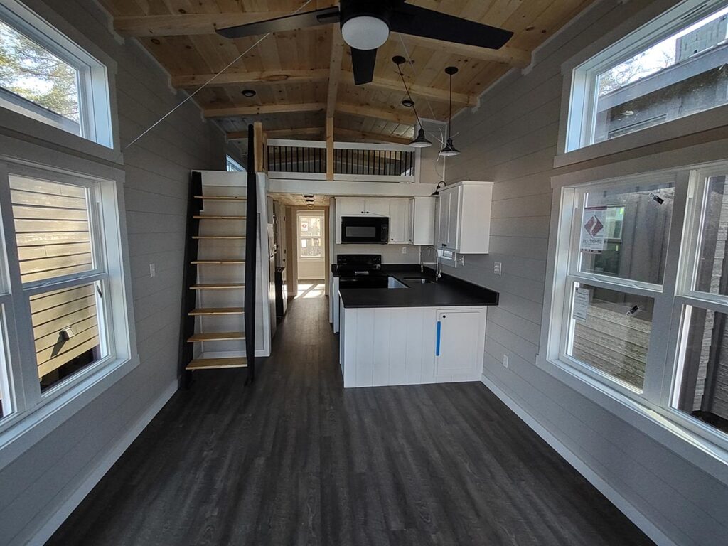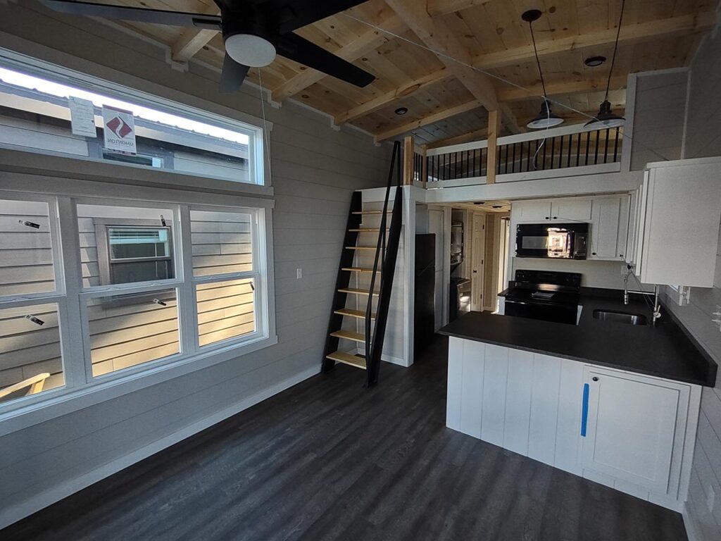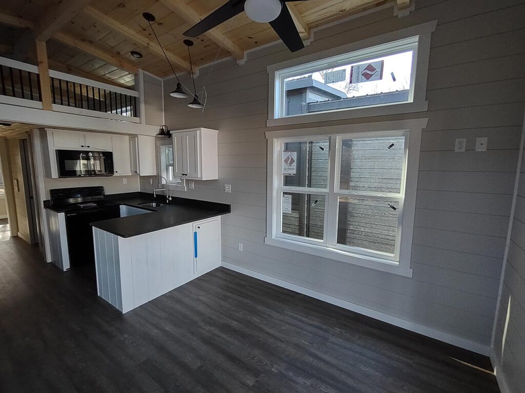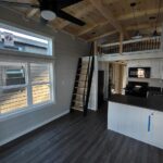 This Smoky model tiny home is a 397 square feet, 12′ x 44′, 1 bedroom, 1 bath RV park model with a loft that comfortably sleeps 6 people.